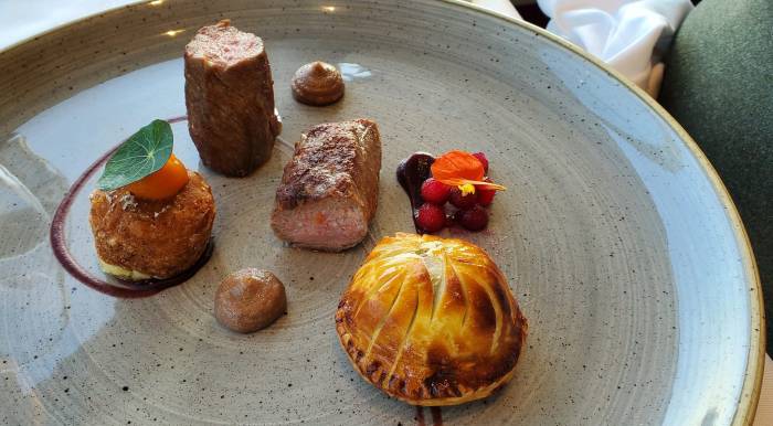 For entrees, we had an interesting mix of pistachio-stuffed chicken Wellington and roasted lamb with tiny pastries.