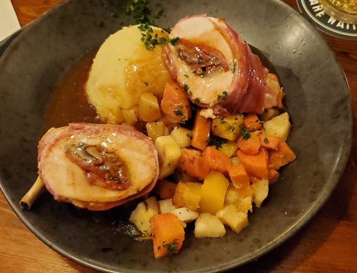 Their traditional potato cakes with smoked bacon and chicken, topped with a creamy mushroom sauce is my second favourite thing on the menu, but the baked goat cheese with beets and pickled veggies is making my mouth water as I type.