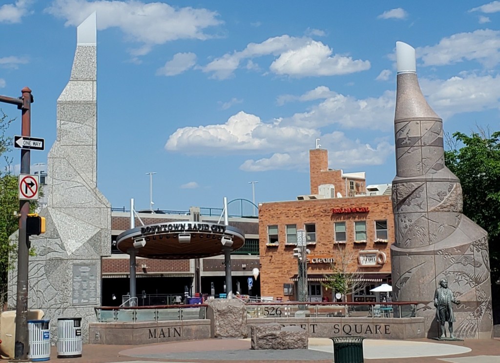 Main Street Square us framed by the Passage of Wind and Water project sculpture.