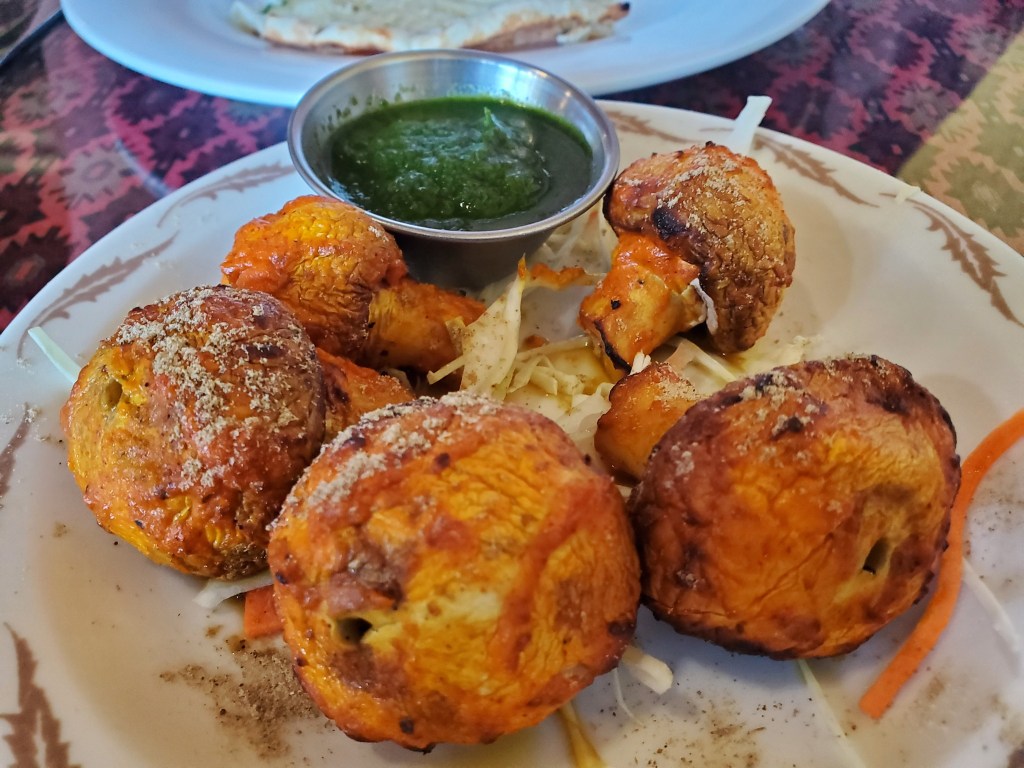 We shared the garlic naan, chicken Saag, and Tandoori mushrooms.