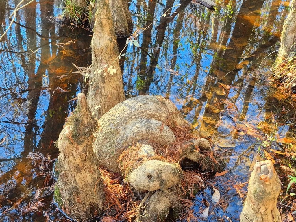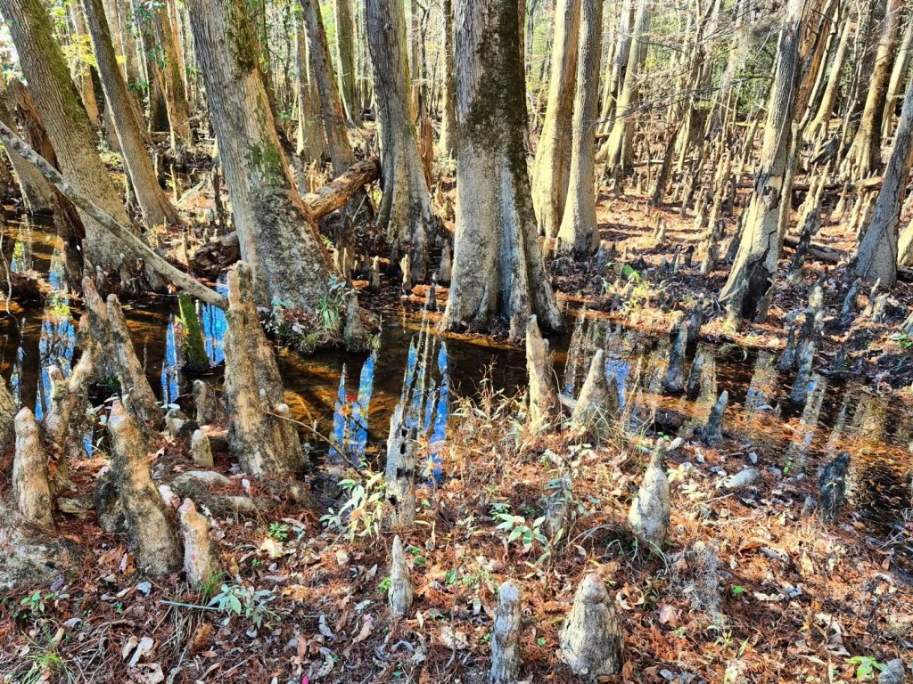 These are known as Bald Cypress “knees” and they are part of the trees’ root systems, helping stabilize the giant trees in wet soil.